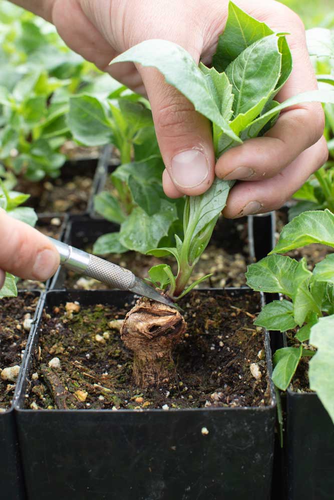 10. I find that, given the ideal environment, it takes 12 to 14 days for cuttings to develop white roots, which indicate that they’re growing. After years of propagating tens of thousands of plants, I have found that the sprouts will take on a greyish cast, and a whole tray will look as if it’s starting to go downhill, about two days before they send out their first white roots. It’s like clockwork: every time I think a tray of cuttings is starting to die, they inevitably send out roots one to two days later. You can gently pull up the cuttings to check on root development.