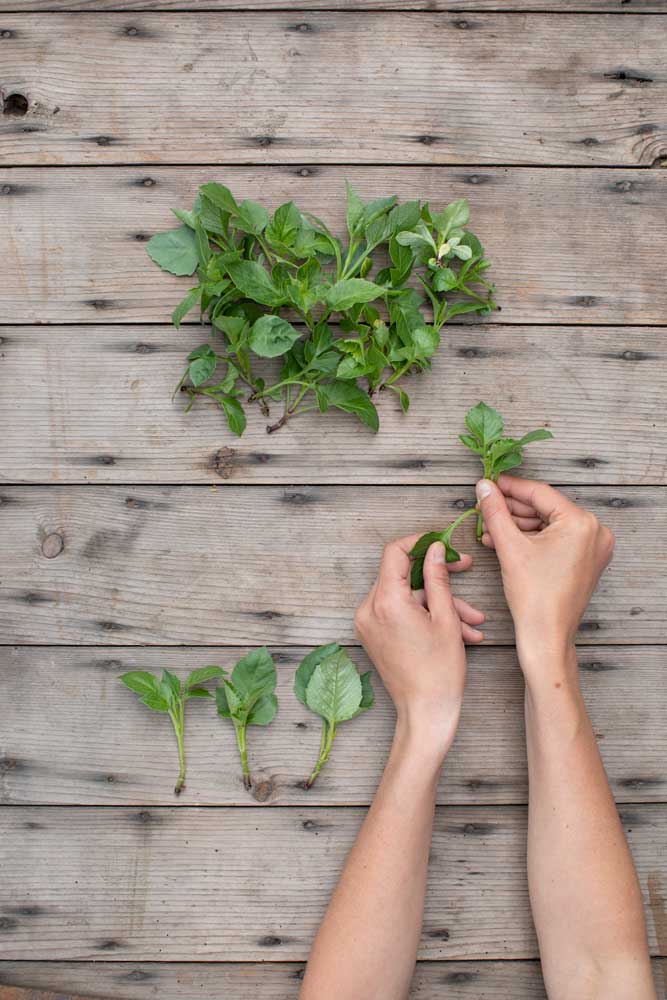 6. Once you have collected a small pile of cuttings, carefully remove the lower two to three sets of leaves from each so that you have at least 2.5 to 5 cm of cleaned stem to work with. If the leaves that sit below the soil line are not removed, they will rot. Do not let your cuttings sit out for more than 15 to 20 minutes, or in direct sunlight, because they will wilt and likely won’t recover.