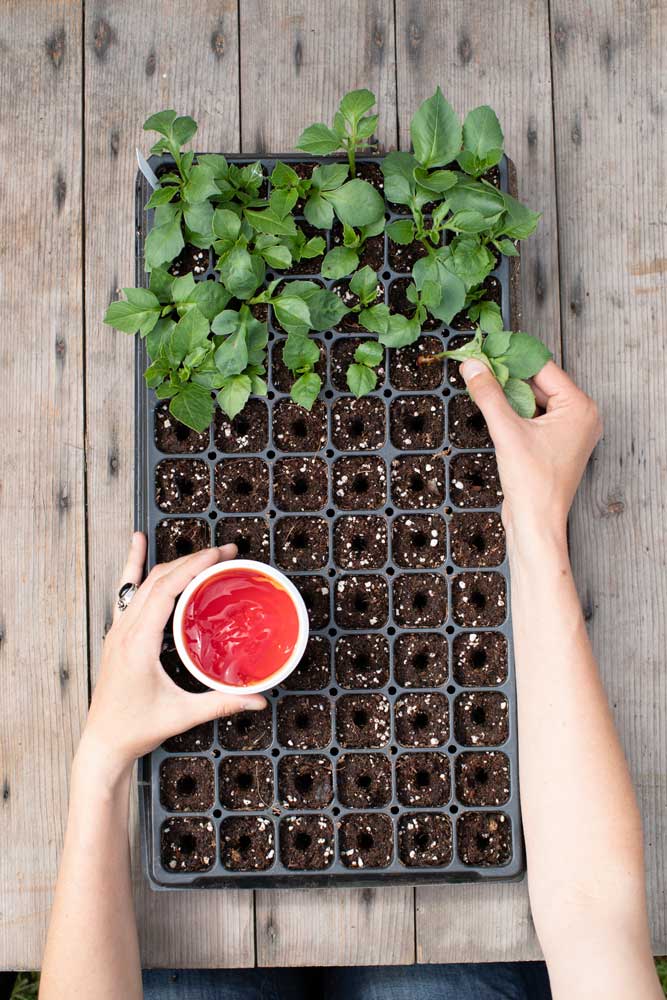 6. Fill a seed tray with coarse potting soil, water it deeply, and poke holes in the centre of each cell, using a pencil, chopstick, or bamboo skewer. Make sure your holes go all the way to the bottom of the tray. You will insert your cuttings into these holes, and poking them ahead of time will help ensure that the tender cuttings aren’t damaged when you place them.