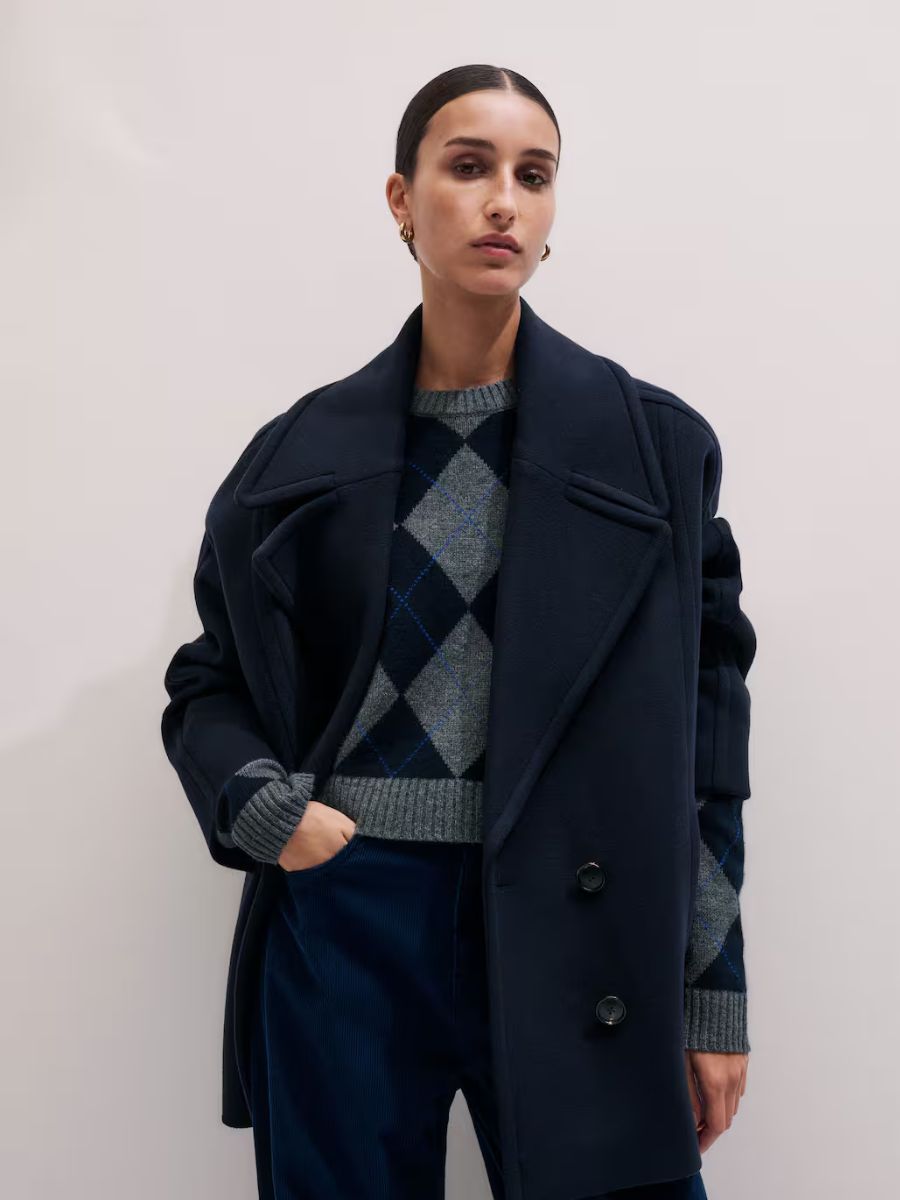 Navy wool cocoon car coat, €755; www.meandem.com.