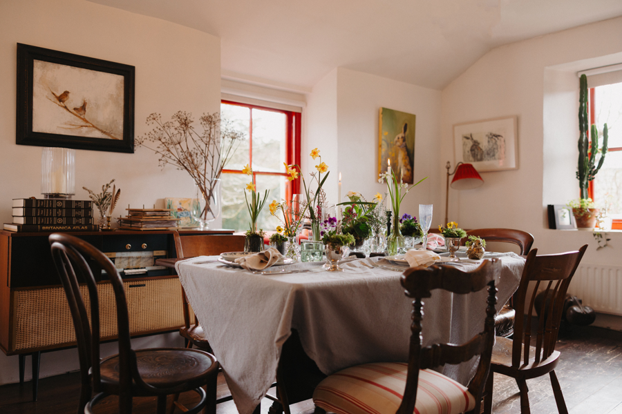 The flowers are tiered at different heights to keep movement flowing across the table and to allow each bloom its own moment. Small antique finds and charity shop treasures add character – cut-glass salt cellars, mixed brick-a-brack and whimsical glassware. Nothing too perfect, nothing too matching, just collected pieces that feel personal and warm.