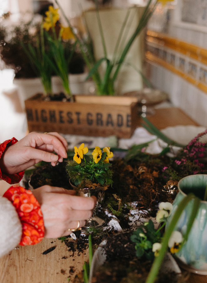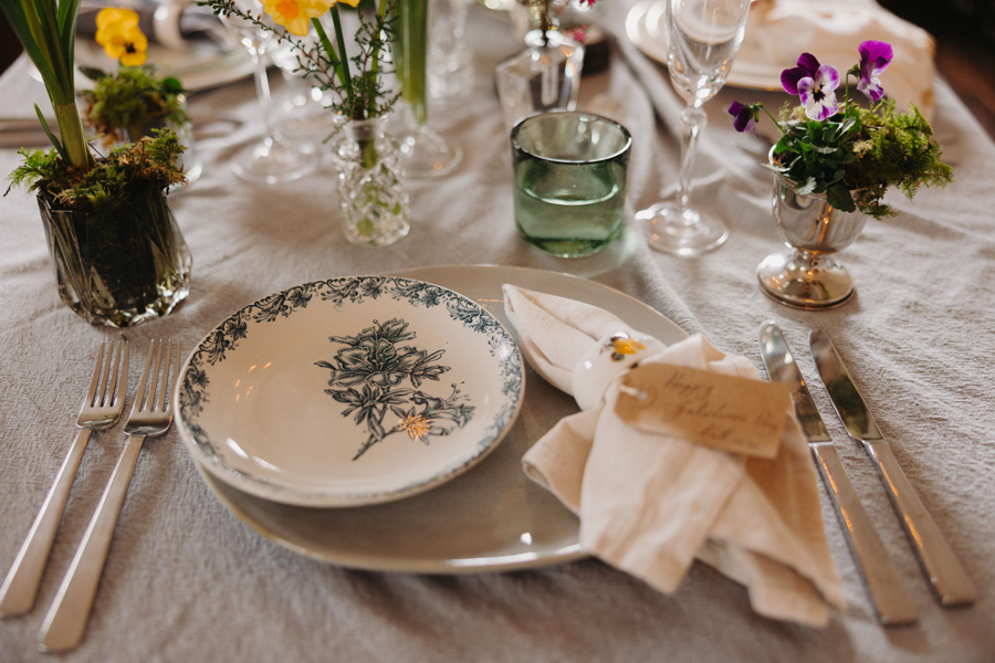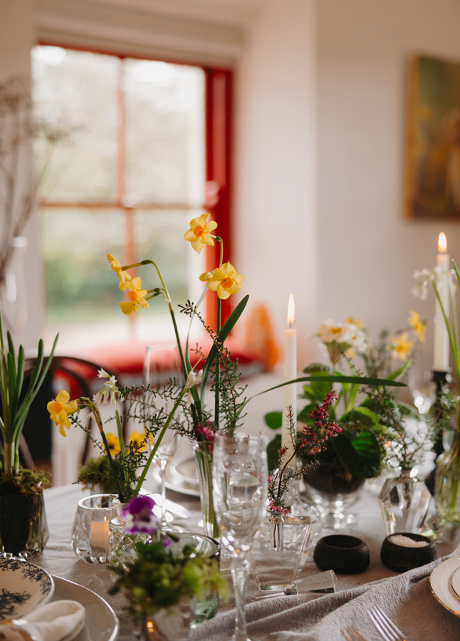 As for the choice of flowers, everything was led by what’s locally available and in season. Daffodils, narcissus, primroses and pansies arranged in a way that feels loose and organic rather than overly styled. Moss is incorporated throughout the table to create a living, breathing foundation, adding softness.