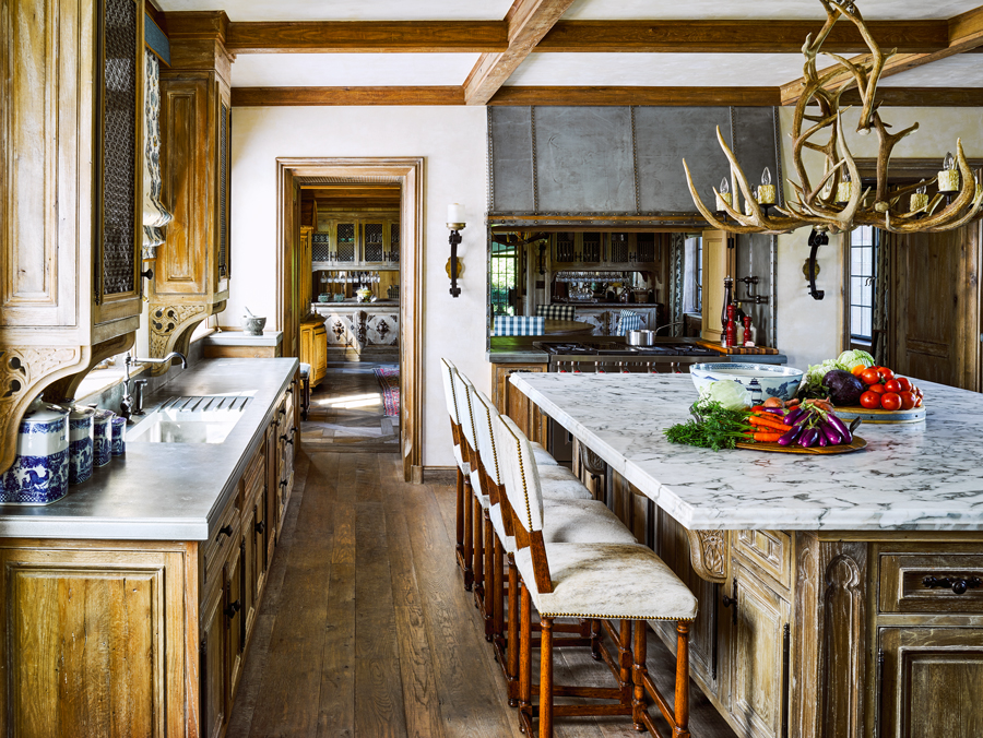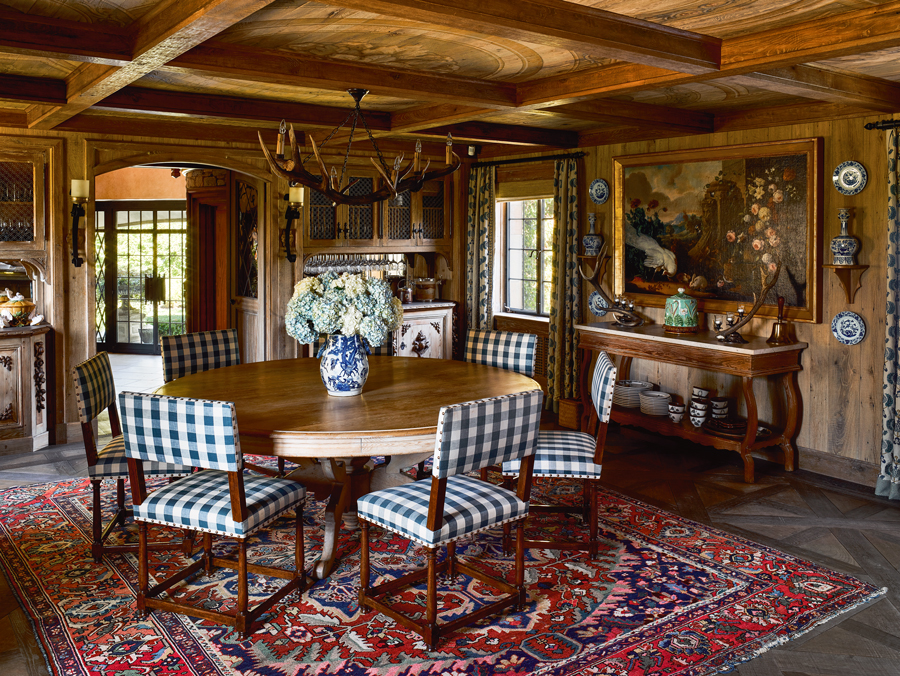 Architect André Tchelistcheff had the task of updating the mechanical systems while meticulously restoring the interiors and exteriors, top to bottom. The roof required three years to complete: clay tiles were templated and cast by hand in Turkey and then installed one by one. For the interior decoration, the couple first called in Cindy Rinfret. Playing up the baronial character of the house, she installed Black Forest hunting trophies and antlers galore. Later, Los Angeles–based designer Martyn Lawrence Bullard added exotic patterns and luxurious textiles. “We started to layer antiques, paintings and textiles to create the kind of country house in which a family would have amassed a collection over generations.”