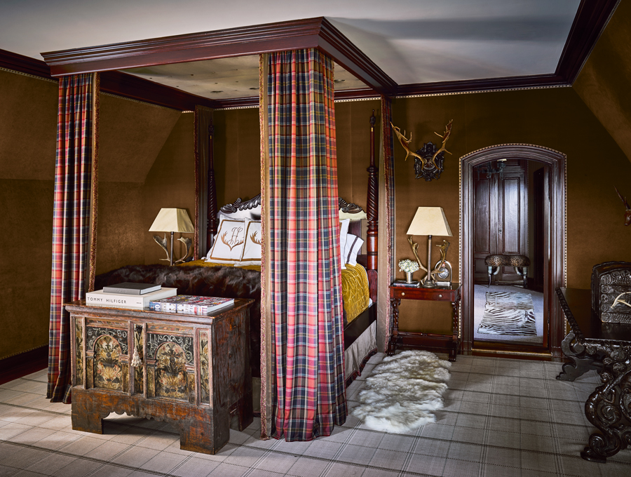 The main bedroom features bed hangings of Scottish tartan. The walls are lined in a chocolate-coloured velvet with nailhead trim and an antique Austrian cabinet chest sits at the foot of the bed.