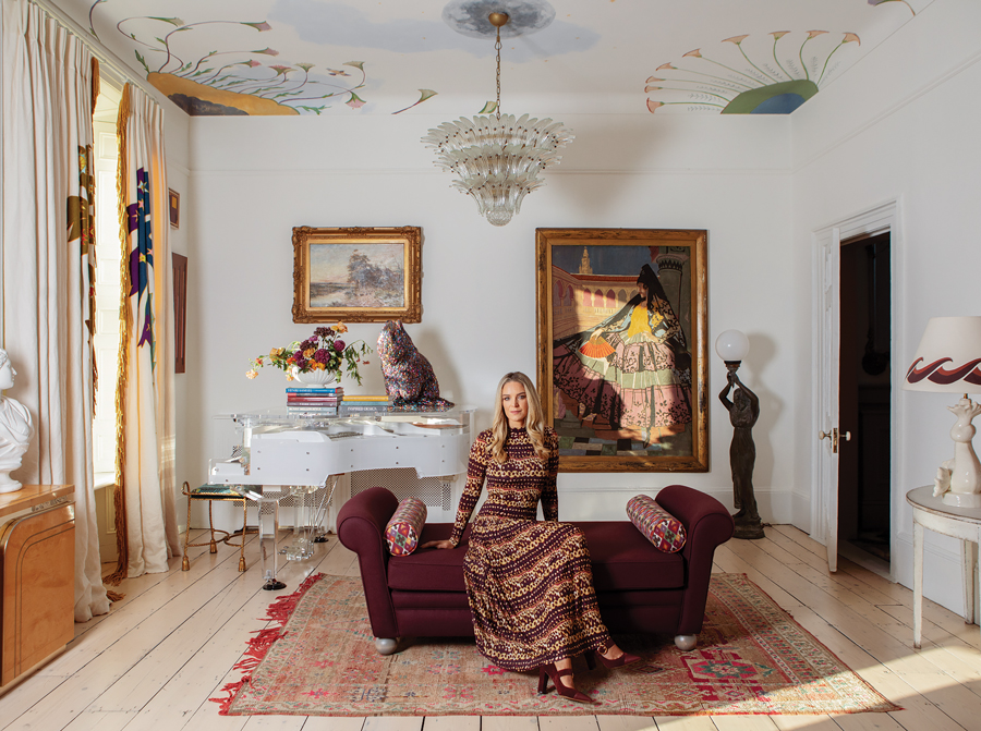 Interior designer Suzie McAdam. The chaise longue is her design, upholstered in a Lizzo velvet, with bolsters in a patterned fabric by Schumacher. The vintage Perspex piano, 1960s piano stool and rug were sourced in various markets. The floor lamp is Egyptian, dating from the 1920s, and the oil paintings are from Suzie’s art collection.
