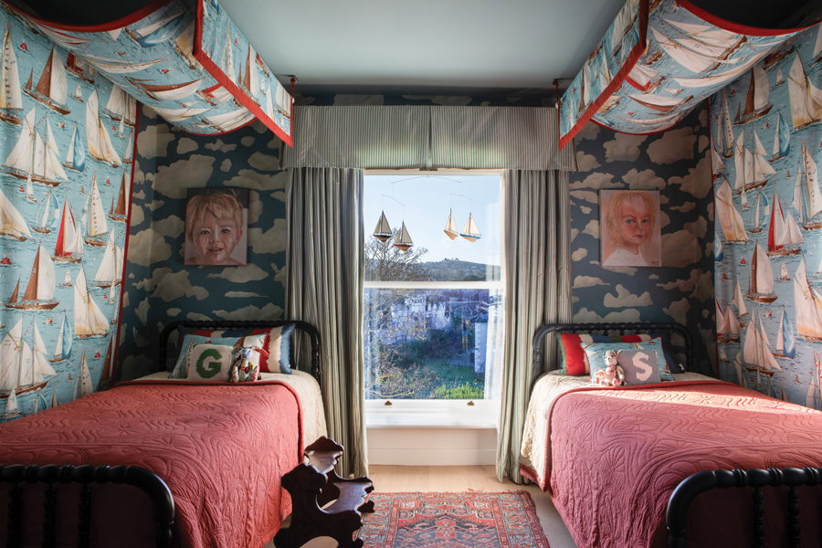 The wallpaper in the boys’ room is Stratus by House of Hackney, with bed canopies and curtains in fabrics by Pierre Frey. The ceiling paint is Bone China Blue by Little Greene.