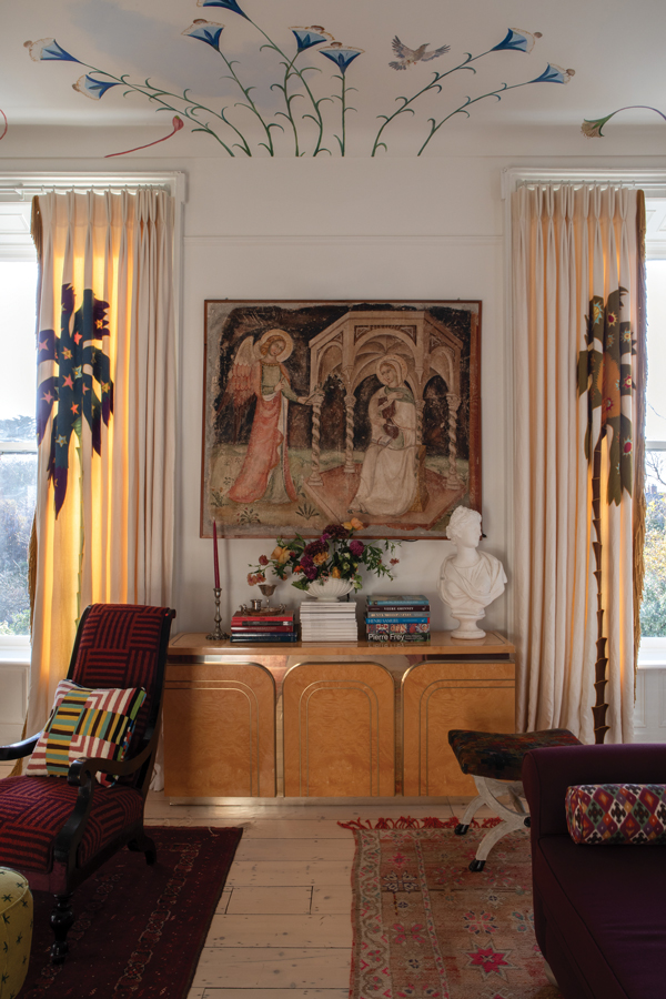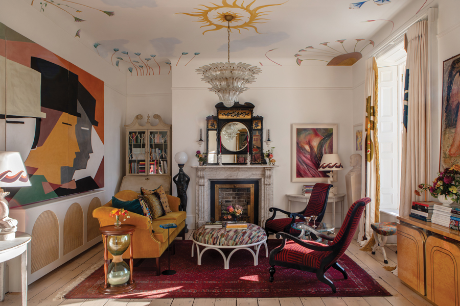Suzie approached the design of the drawing room from a place of passion and personal connection. “This is a perfect example of a scheme where my brain is on display!” Many of her projects involve using murals: “They are so expressive.” The distinctive hand-painted ceiling-scape was commissioned from Irish artist Michael Dillon. Somehow, Suzie knew that this would work beautifully with the 1970s Tophat Triptych on the wall behind the vintage camel-backed sofa and the other pieces of unique furniture in the room, many Egyptian-inspired. “I am obsessed by Egyptology. I am drawn to its geometry and the palette which can feature a lot of ochre, burgundy and black.”