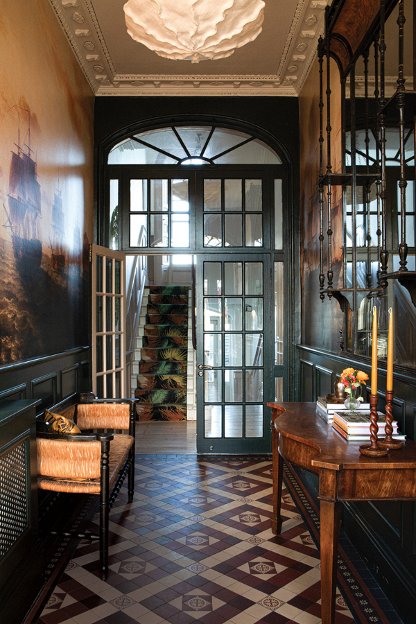 The dramatic entrance hall with a wallpaper scene reproduced from a picture in the V&A, and antique chinoiserie mirror, French woven bench and mahogany side table, all sourced from antique markets. The wall panelling and internal doors are painted in Studio Green by Farrow & Ball. A glimpse of the staircase runner beyond reveals it to be Pierre Frey’s Palmador in pink.