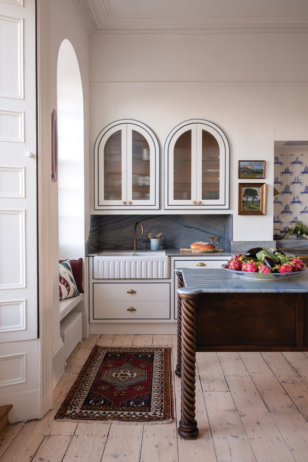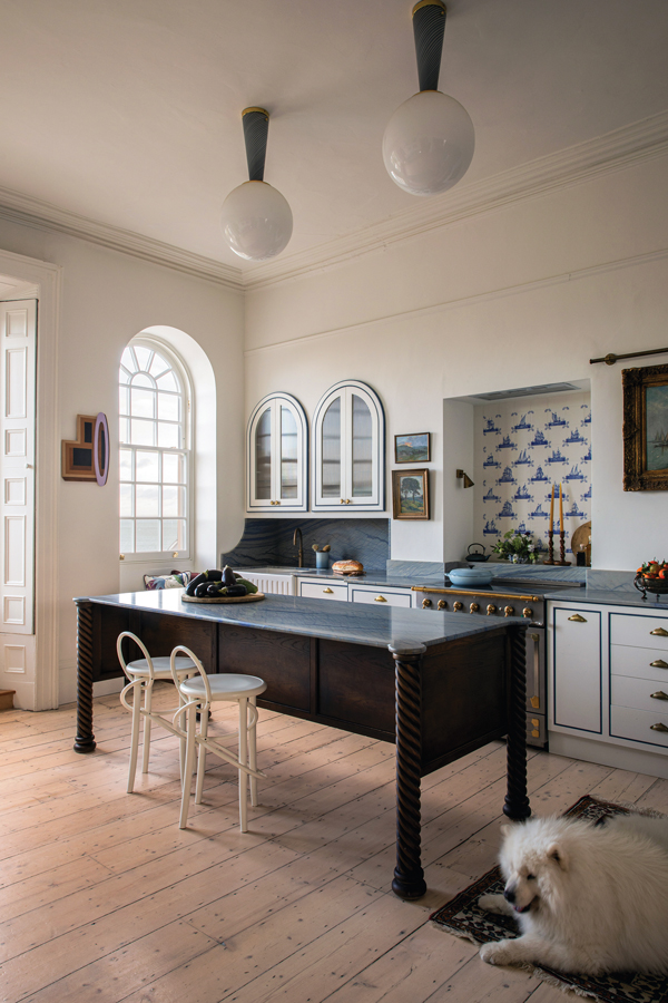In the kitchen, with the family’s husky Mischko’s favourite spot the 1940s Moroccan rug, the walls are painted in Little Greene’s Flint, pendant lights are from Magic Circus, the cabinetry and island designed by Suzie McAdam and made by David Crowley Furniture. The white-stained oak stools are by Martino Gamper from Gebruder Thonet, Vienna. The hand-painted delft tiles are from Victorian Ceramics and the stainless steel and brass range from La Cornue.