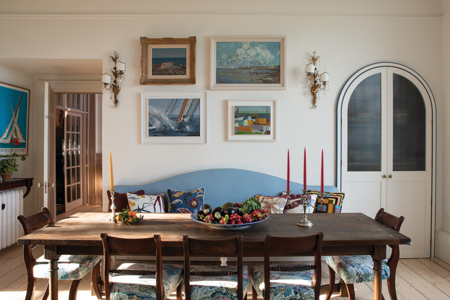 The kitchen, with its freestanding island, curved window overlooking the sea, arched cupboards and range in the original fireplace opening, has a timeless and traditional air. “I love to cook so the aesthetic here had to be very useable and practical – with a young family, functionality is key.” Here, the statement piece is the magnificent (and mobile) kitchen island, which Suzie designed using the idea of a traditional dairy table as a reference point. “Building an interior around a centrepiece helps generate spontaneity.” She also designed the banquette and kitchen table, and the cabinetry. “I find modern kitchen joinery can be monolithic and overly functional-looking so I analysed the existing proportions of the room very carefully and working with what was there, created what I hope is a both clean and timeless effect.” The palette is soft, with vibrancy delivered courtesy of the art arranged on the walls and an abundance of scatter cushions.