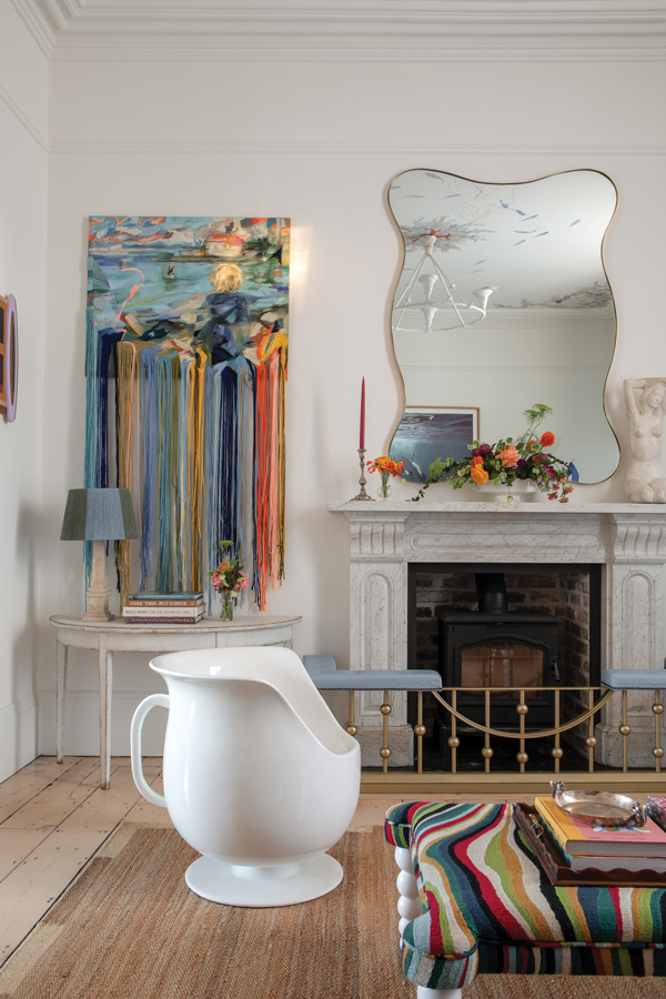 Craft, comfort, colour and detail are combined in the sitting room. The fibreglass Tea Cup chair, ottoman and artwork bring a touch of frivolity.