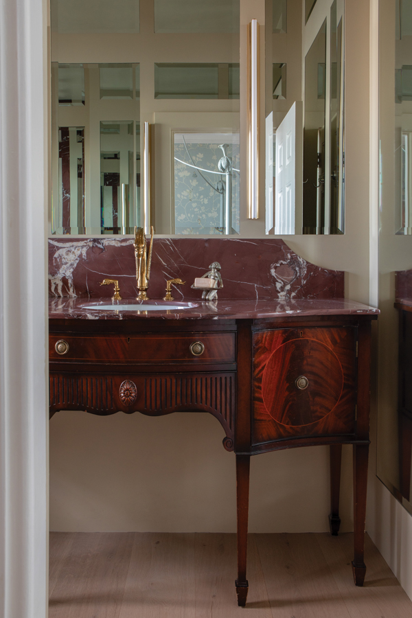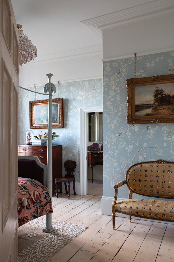 Responding to the atmosphere of a space, says Suzie “is what I really love.” The master bedroom with its custom four-poster and canopy, Georgian chest with Cherry Kawasaki wallpaper by Pierre Frey, and antique loveseat, demonstrates how she makes the grand feel intimate.