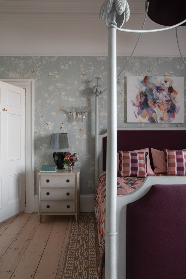 The wallpaper in the master bedroom is Cherry Kawasaki by Pierre Frey. The four-poster’s canopy is by Porte Italia in a Lizzo fabric. The bedside table is from Chelsea Textiles, and the bedside lamp from Villa Bologna Pottery with shade by Birdie Fortescue. The artwork is Doriane by Duc Pham, 2023.