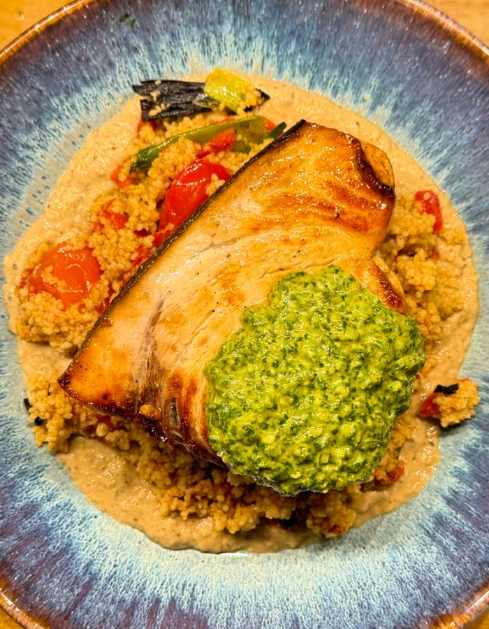 SWORDFISH WITH ROASTED AUBERGINE PURÉE, CHARRED VEGETABLE COUSCOUS AND CHERMOULA