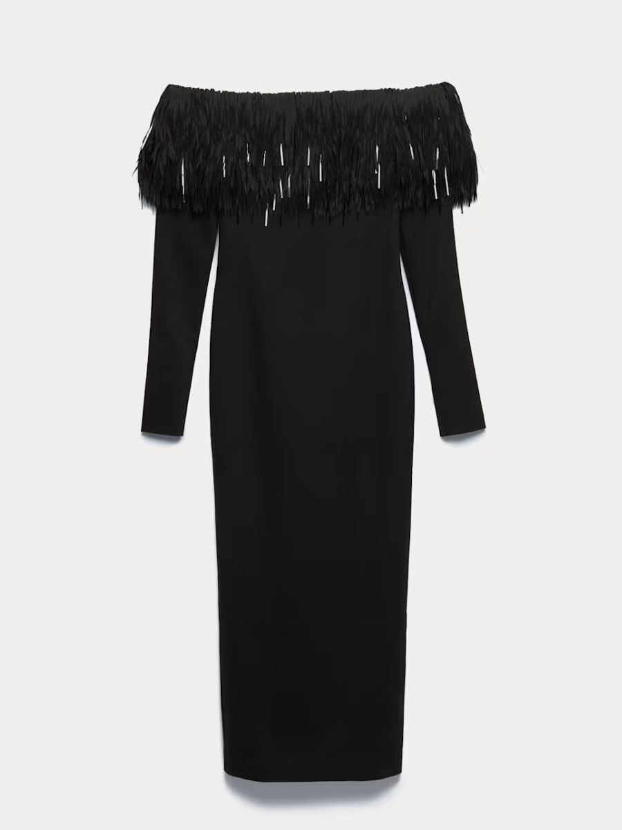 Black Bardot-neckline feathered bodycon dress, M&S x 16Arlington, €245, at Marks & Spencer.