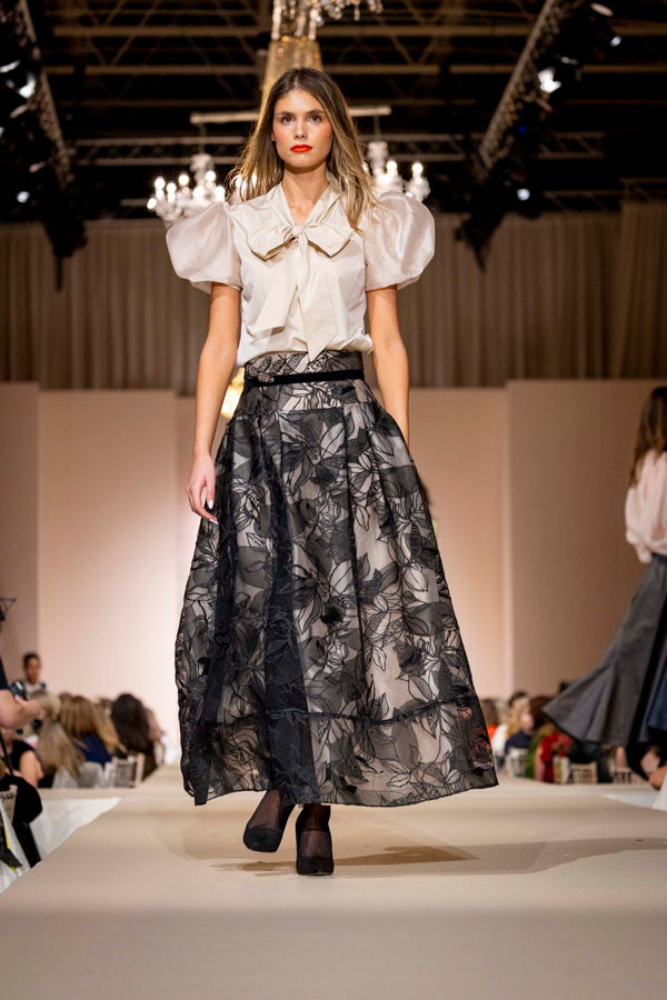 AndTate, the creation of celebrated Irish fashion designer Sharon Hoey and Richard Tate, delivers dresses, skirts, blouses and gowns for the modern woman. Its elegant occasionwear always makes a statement on the Look the Business catwalk. There were puff sleeve tops, embellished detail skirts and dramatic structured tops and skirts. A pale “kiwi” green satin top and skirt worn with velvet opera gloves opened the segment. A pale pink sheer blouse with dramatic bow collar, worn with a bronze circle skirt, is the update your event wardrobe deserves.