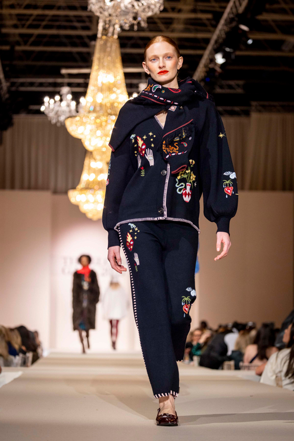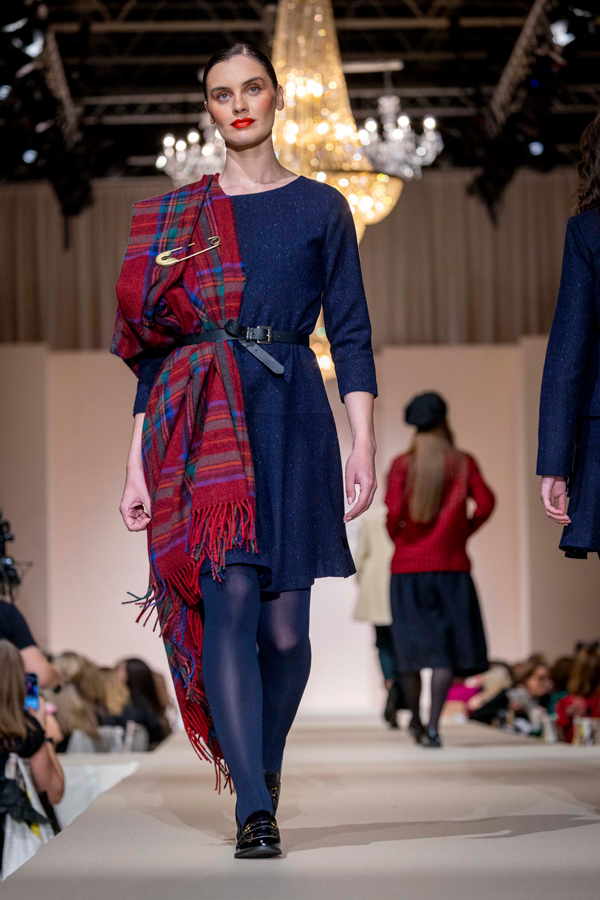 Magee 1866 presented its signature collection of heritage tweed and wool coats in shades of chocolate, rust and teal. There were check coats, oversized capes and houndstooth suits from the fifth-generation family brand based in Donegal. An ivory coat, burgundy knit sweater with floral Liberty-print shirt collar peeking out, and teal corduroy trousers looked smart paired with black leather loafers. A navy cropped wool jacket with matching skirt was finished with a navy and green check scarf, while a navy wool dress was layered with a red tartan wool throw. The final look, an oversized navy tweed coat, is one you will want to wrap up in all winter long.