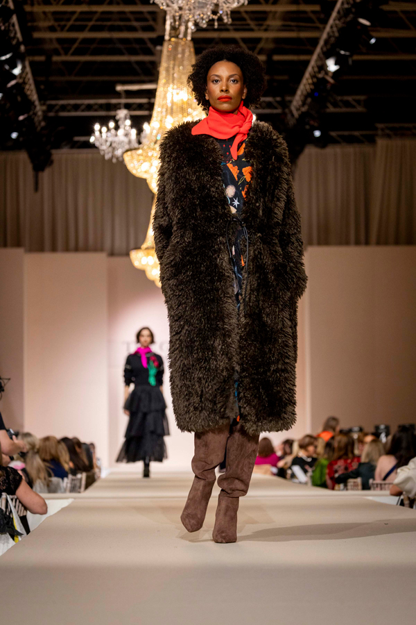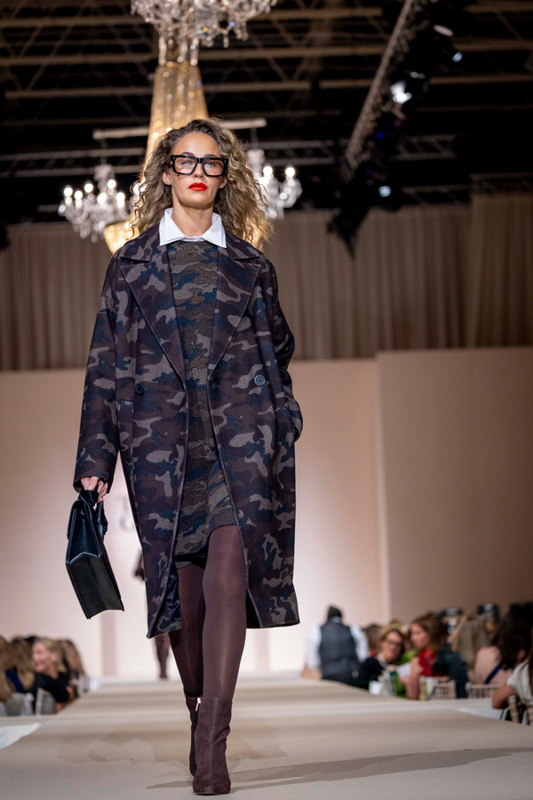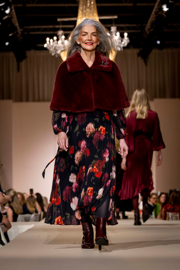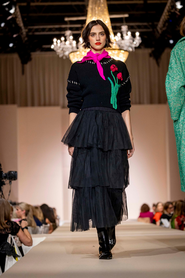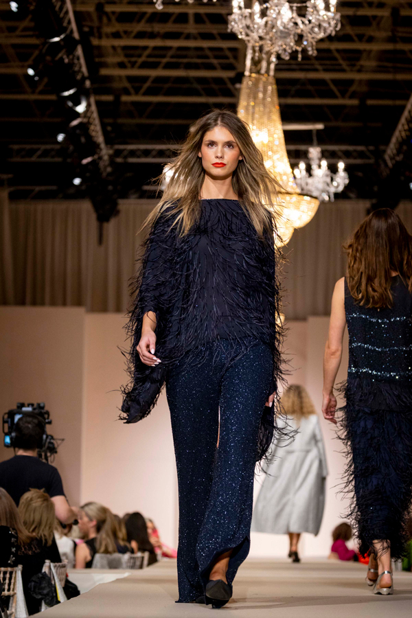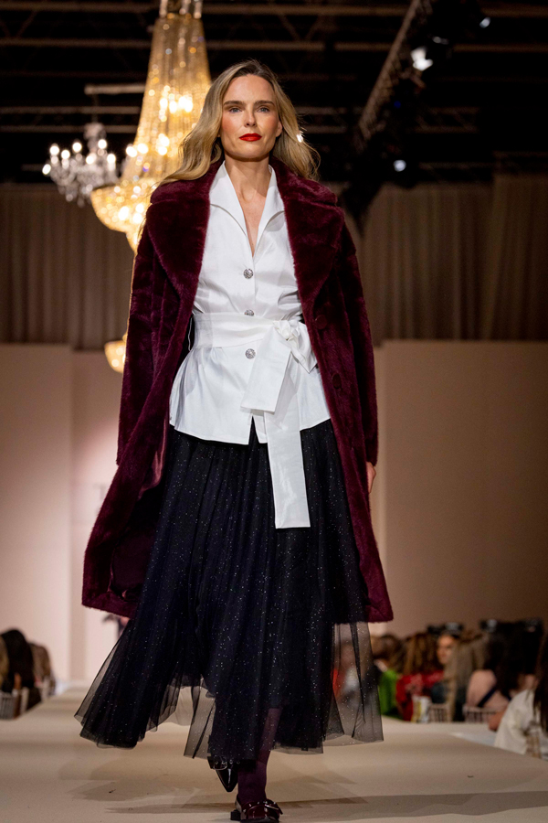 With its timeless approach to desk to dinner fashion, Joseph Ribkoff appears to be the go-to brand for busy women who want to dress with flair for work, events and special occasions. With an array of evening looks on show, the brand’s merlot faux fur coat was worn with a white belted shirt and black sparkly tulle skirt. The perfect shade for the festive season, a merlot pleated satin dress adds extra interest with its black lace sleeve detail, while a black embellished blouse with matching evening trousers offers an elegant update on a monochrome look.