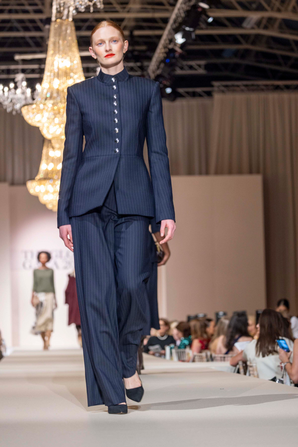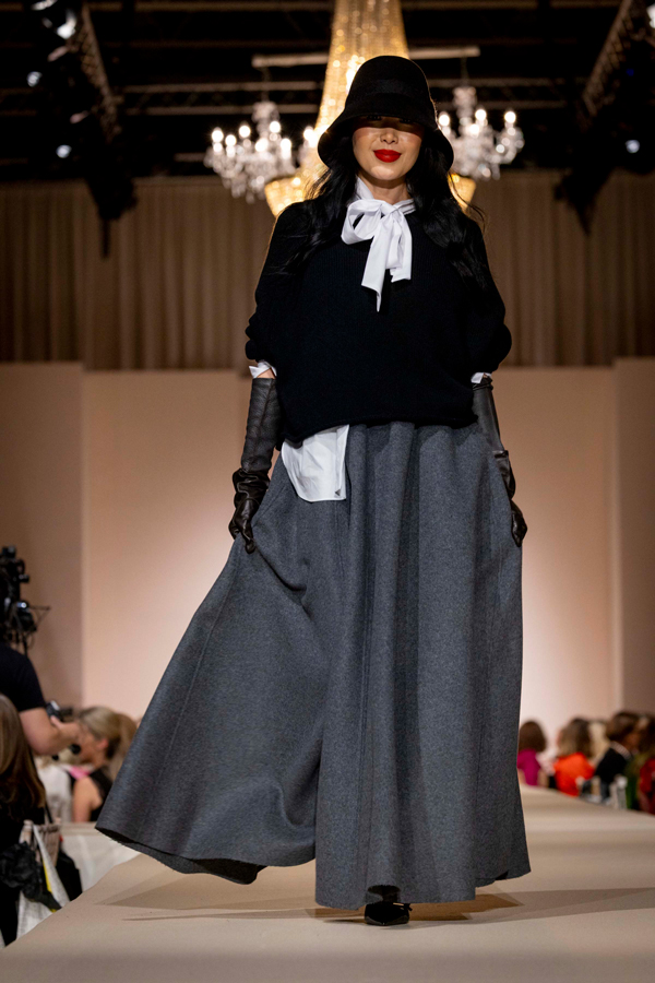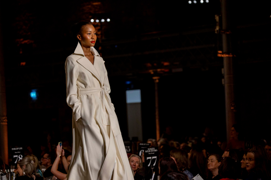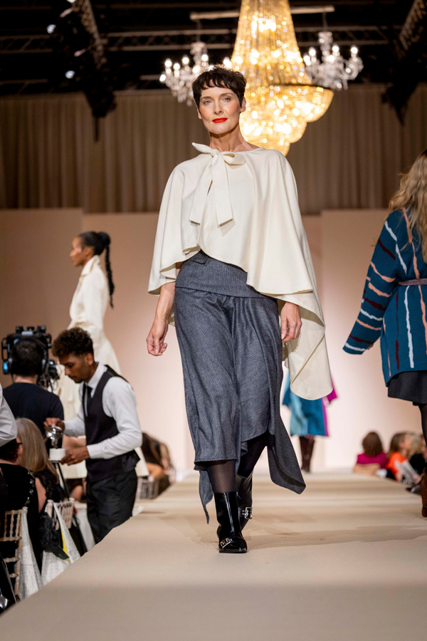 Irish designer Louise Kennedy closed the Look the Business fashion show with a dazzling display of pieces from her AW25 collection. Feather detailing, embellishment, beading – it had all the hallmarks of a fabulous festive wardrobe. A standout was a navy embellished silk top with a navy feather silk skirt worn with silver pointed-toe shoes. An ivory wool jacket and cropped black slim trousers with a tuxedo shirt and black bow-tie masters the art of desk to dinner dressing. And finally, a sleek one-shoulder asymmetric embellished silk dress closed the show – a magnificent finale.