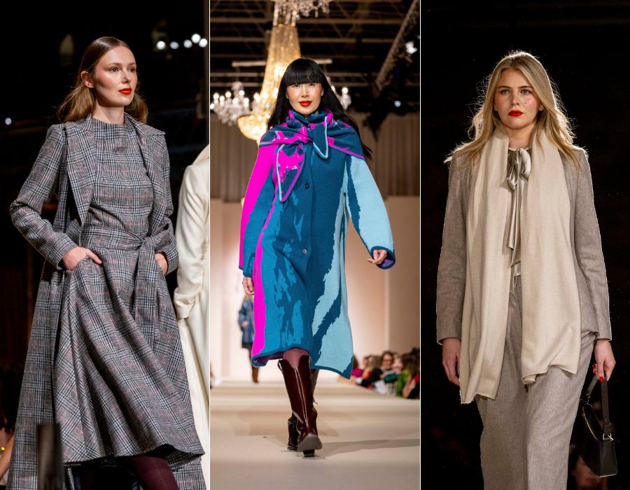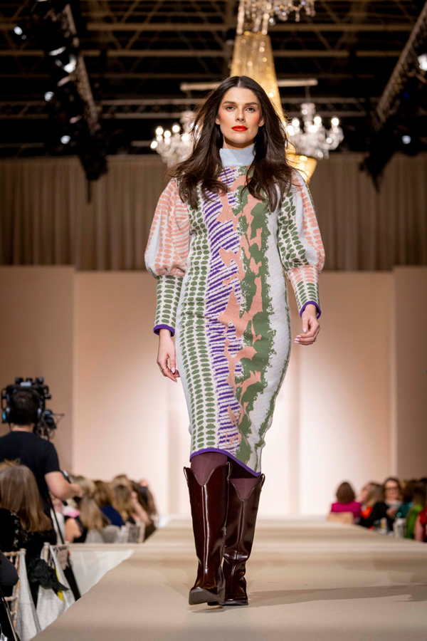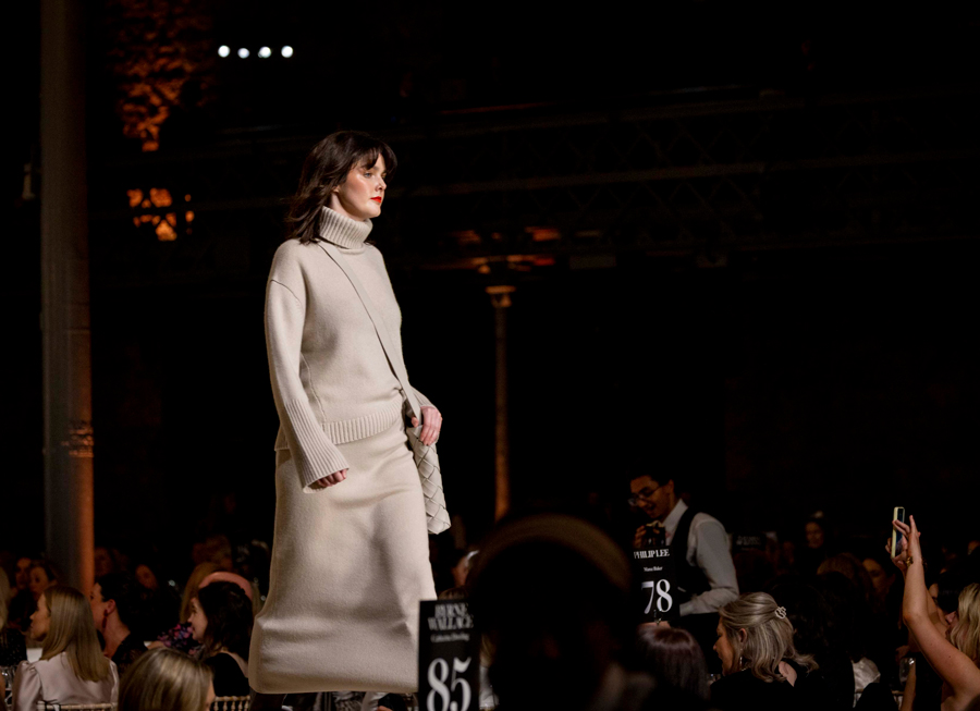 Next up was Guaranteed Irish, which presented looks from three of its members, Urban Aran, Noema and Helen McAlinden. Urban Aran made an entrance with a teal and cerise graphic knit coat and matching scarf. Noema’s chic winter white wrap coat was followed by a grey check coat with matching skirt and top. Helen McAlinden’s delicate satin blouse was worn with a beige wool blazer and matching wide-leg trousers – and a latte cashmere sweater with a matching A-line skirt looks comfortable and chic to take you from the office to post-work events.