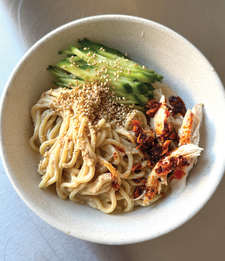 The sesame noodle recipe I’m sharing this month is something I return to again and again, whatever the season. I love going to the Asia Market on Drury Street and stocking up on chilli oils, noodles, crispy shallots and frozen dumplings. It means that even on the days when I really can’t be bothered, I know there’s something in the freezer that can become dinner, or tomorrow’s lunch, with very little effort.
