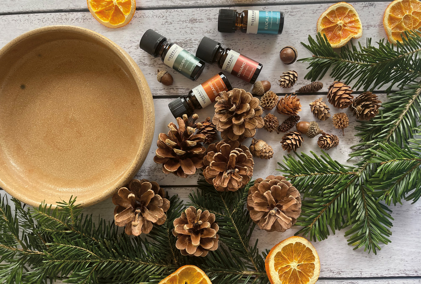 1. Arrange the tree trimmings or rosemary in the bowl. Tuck in the orange slices and top with the pinecones and acorns.