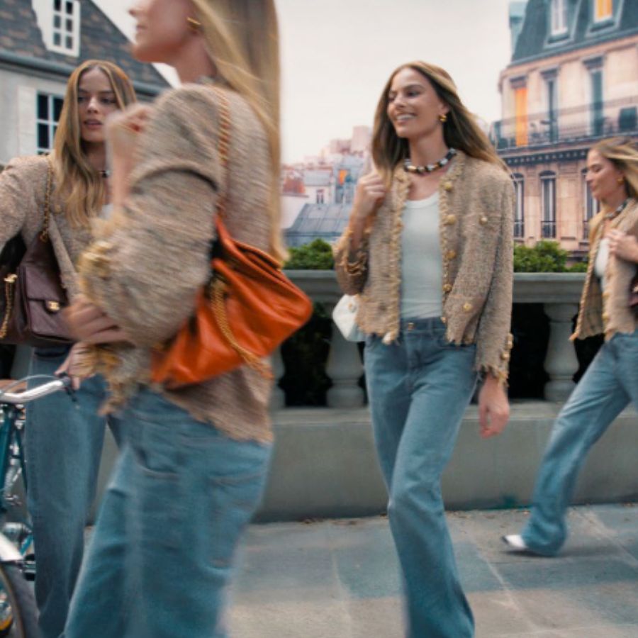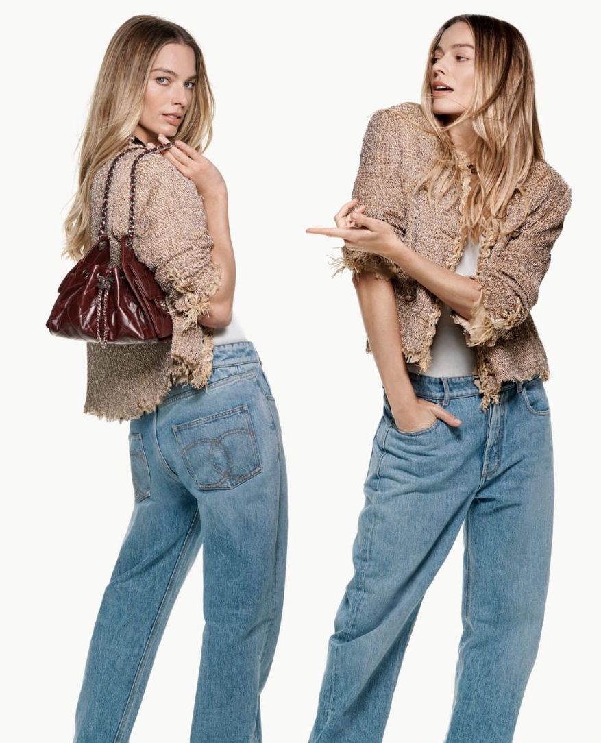 Equally as noteworthy is the clothing. Robbie’s style for the campaign, according to Chanel, is both sophisticated and casual. She wears mid-waisted jeans that are a hybrid of baggy and straight, a white tank top and a Chanel tweed jacket; her hair is softly textured, her makeup is minimal. It’s a low-key but polished choice that’s familiar from the Métiers d’art 2026 collection – its first look, which featured a quarter-zip knit and jeans, went viral. There are no overblown fashion statements, rather Robbie reminds of an ‘It’ girl on the front row, or a micro-influencer who might pop up on your discover page. There’s an air of Vanessa Paradis, rather than an A-lister. And while we’re not branding Chanel tweed as attainable, the idea of jeans and a cropped jacket resonates with most of us.