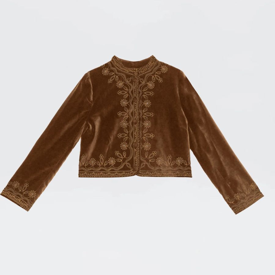 Tan embroidered jacket, €460, at Rixo.