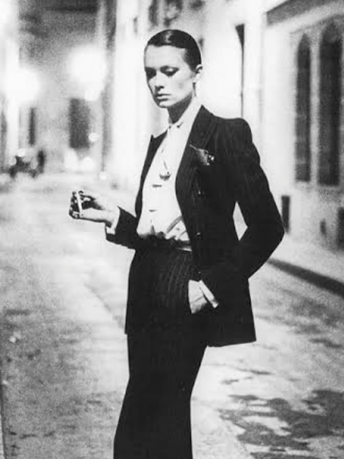 Blame The Blonde, une femme d’un certain âge, a born and bred Dubliner, still smokin’ hot with legs up to here, a tight Pilates core and sultry hooded eyes; better yet, blame Charlotte Rampling, still smokin’ hot at 79, she of the sultry hooded eyes (blepharoplasty be damned) and captivating gaze, promising pain and pleasure in equal measure. Muse to fashion designers (YSL and Dior) and fashion photographers (Helmut Newton, Juergen Teller, Terry O’Neill), Rampling remains an enduring inspiration to women of all ages, embodying classic, sophisticated, edgy French style. While we’re at it, blame Bianca for marrying Mick in Saint Tropez in 1971 in an ivory Yves Saint Laurent Le Smoking tuxedo jacket, sans shirt, four years prior to Helmut Newton’s iconic photoshoot of androgynous model Vibeke Knudsen in a desolate Parisian alleyway, slicked-back hair, ciggie in elegant hand, in a crisp white cravat and a YSL tuxedo: louche, potent, unapologetically sexual. One tux to rule them all, and almost 60 years since Saint Laurent first showed it as part of his AW1966 Pop Art collection, still relevant. The Blonde tasked me with finding hers: pristine, preloved, perfectly timeless.