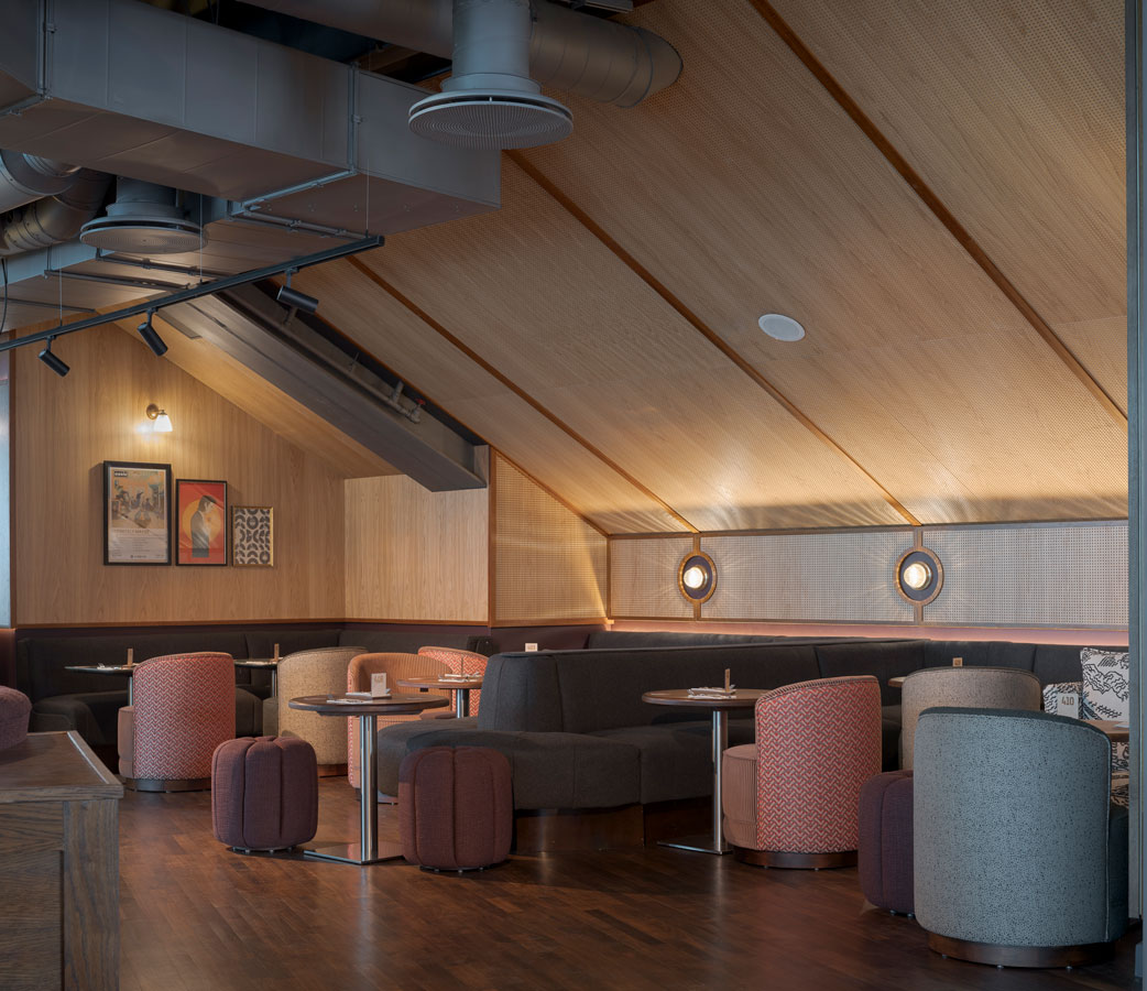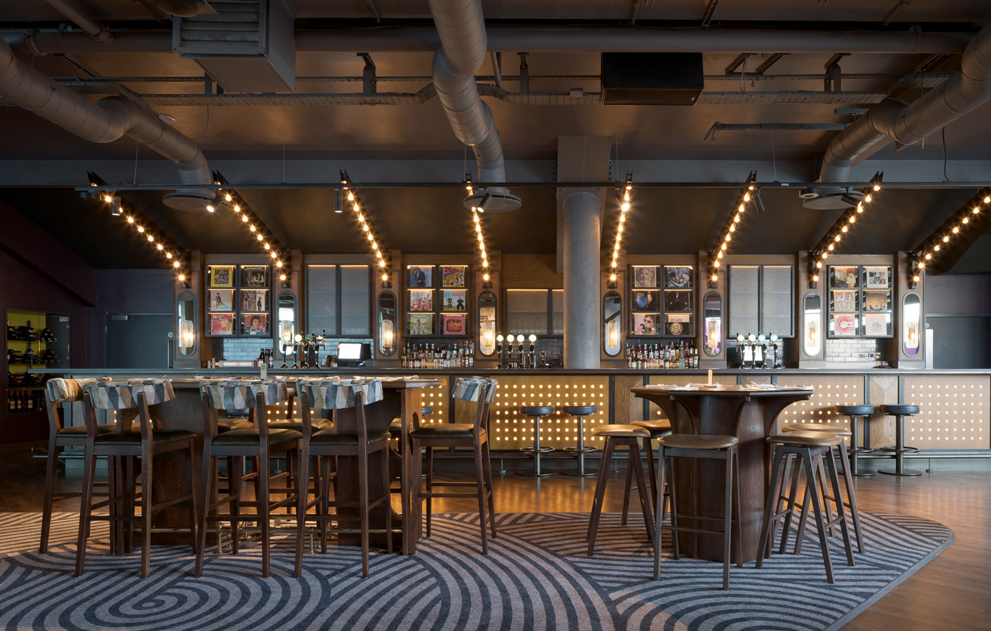 Newly refurbished, The Premium Club has been renamed the Studio, in keeping with its exciting new retro vibe and energy. Design details include vintage speakers, framed gig posters, record displays and perforated timbers suggesting a recording studio. In fact, the language of sound was an essential element in the creation of this space that appeals to all the senses. The spin of the record, the crackle of the needle drop, the pulse of the speaker and the rhythm of a sound wave … these are all incorporated in the décor creating an abstract visual homage to music’s raw energy and emotion.