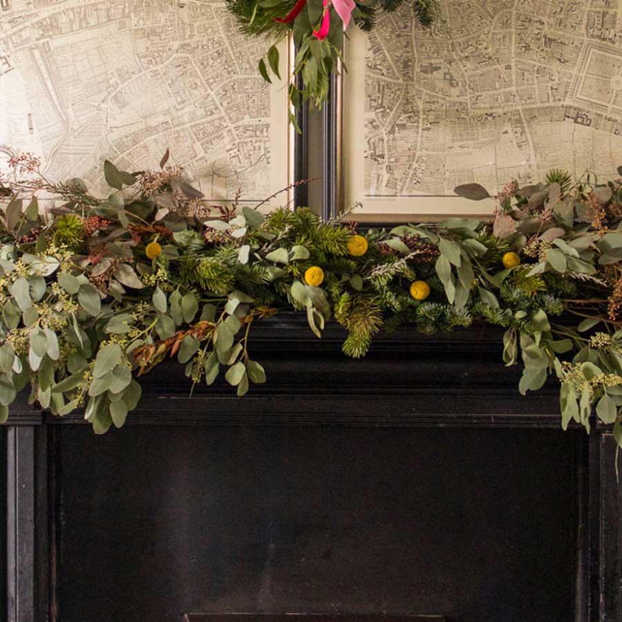 I love using as many natural elements as I can such as garlands, Christmas tree cuttings and ivy clipped from our back wall. I use coloured baubles that do all the in-between work and cover up any gaps!