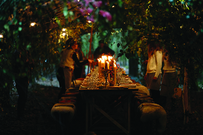 Create magic with twinkling candlelight: Lens + Larder’s legendary lunch for Hermès at Ballyfin also featured cosy wool seat pads, Irish wool throws and tweed-covered hot water bottles. Photograph by Doreen Kilfeather.