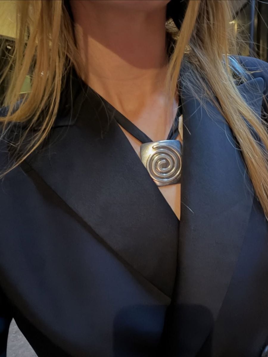 Cool girls all over fashion month are embracing long necklaces that whisper of quiet bohemia. Usually coming in silver, these talismanic chains boast mystical symbols, or lockets that look like they could be filled with patchouli. This one, worn by model Maya Stepper, is from her own brand. The whole vibe speaks to an aesthetic Allison Bornstein describes as “chic desert aunt”: we think they look entirely fresh.