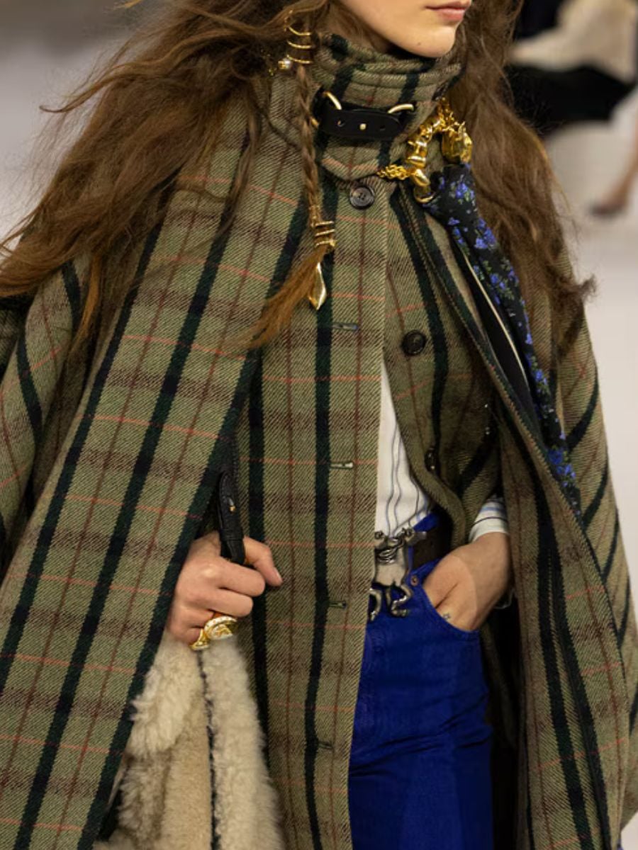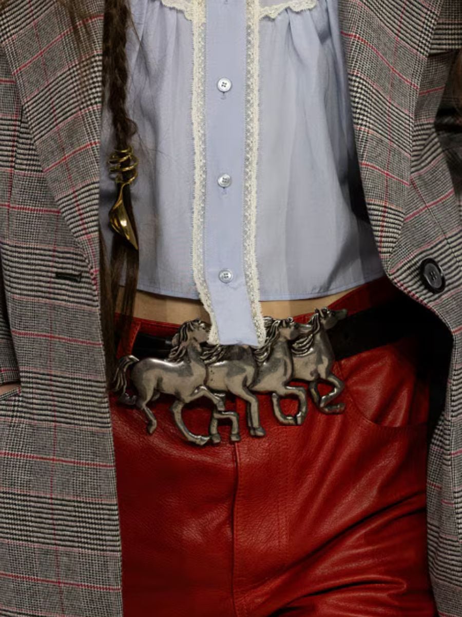 For AW26, Chloé’s cool-girl has departed the bohemian Left Bank and headed for the wilderness. “She’s got wild hair and she is very free,” explained model Raquel Zimmermann backstage at the brand’s Paris show. Meanwhile, Chartrand name-checks the striped jeans and hair accessories at Chloé as a favourite moment from Paris. There’s a folklore aesthetic defined by chintzy ruffled shirts, moody florals, check print dresses, flashes of shearling and thick woollen socks (or, possibly, tights). There were also riffs on rodeo dressing with leather trousers, Western boots, tiered skirting and long plaits. All in all, the proposal for a haute horse girl had appeal.