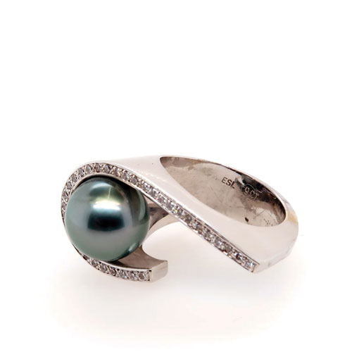 18ct white gold pavé diamond and Tahitian pearl ring, €1,995, at ESL, 2 Chatham Street, Dublin 2.
