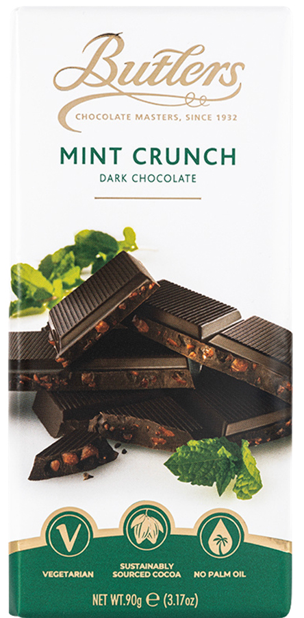 58% dark chocolate, magnificently minty with crunchy butterscotch pieces.