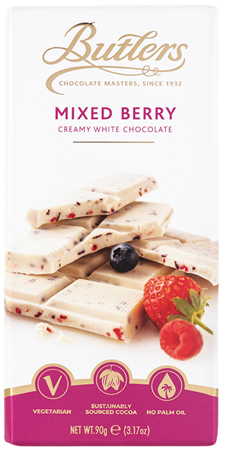 Creamy, white chocolate flavoured with an array of mixed berry pieces. The pick of the bunch. Light and velvety – a fruity indulgence for colder days.