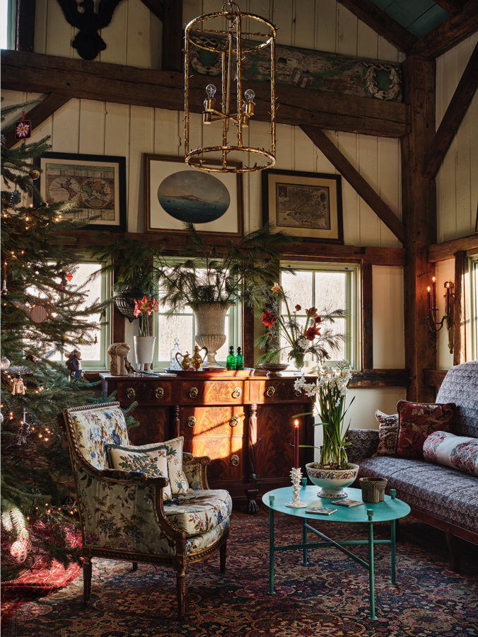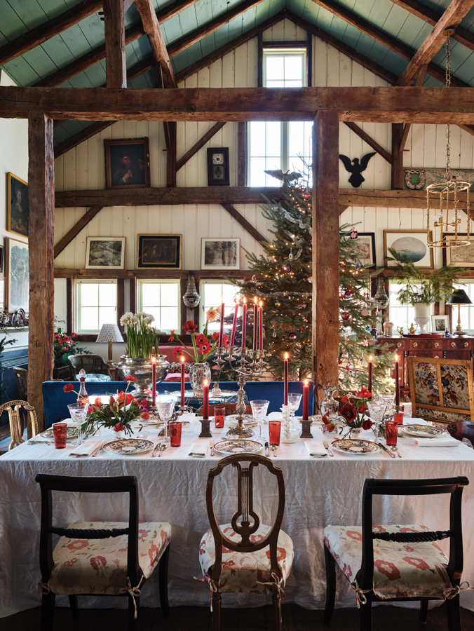 “I love to entertain in the cold, dark months. I will move our dining table around to new locations in the living room to accommodate larger groups – for Christmas dinner or birthday parties. It’s so fun seeing a room arranged just a little differently than it normally is. And though I love a densely patterned tablecloth, I also love setting a delicate white linen or lace cloth on the table, dressed in polished silver and fine, fussy plates and crystal. A fancy party in a decidedly unfussy barn once meant for hay and livestock feels right to me.”