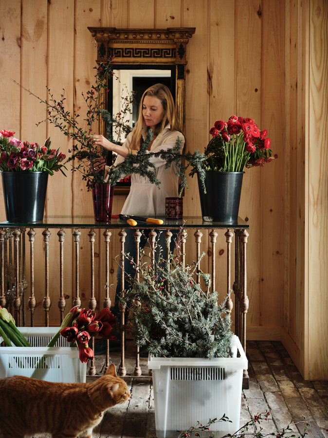 “I love to forage in the winter. Bittersweet vine, which my husband wars with each summer for choking our trees and bushes to death, makes for a fabulously sculptural flourish even after its berries have shriveled to little crimson droplets. For Christmas, I chop down evergreen branches for large-scale and festive urn arrangements (beware the sap). I have a soft spot for traditional bulbs – potted amaryllis, paperwhites. Our geraniums come in, refugees from the cold, and they winter on our living room floor. There’s something beautiful about the repetition of it all, reminding me of the temporary yet cyclical nature of all things.”