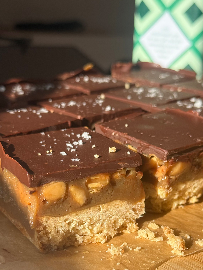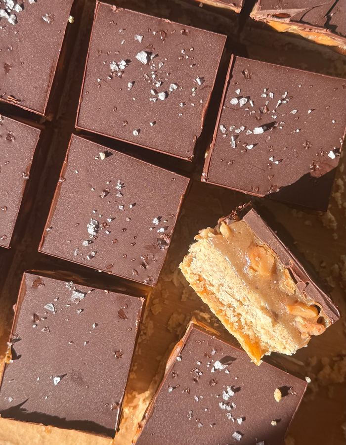 9. Pour this mixture over the caramel, and tip the tin in each direction until it has covered the entire surface. Refrigerate for at least 4 hours, or until set.