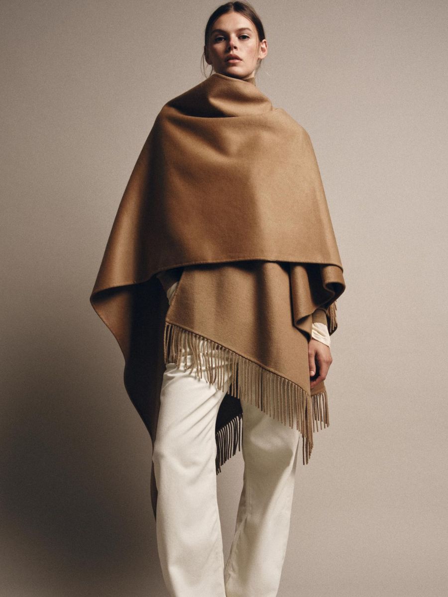 Beige wool-blend fringed cape, €99.95, at Zara.