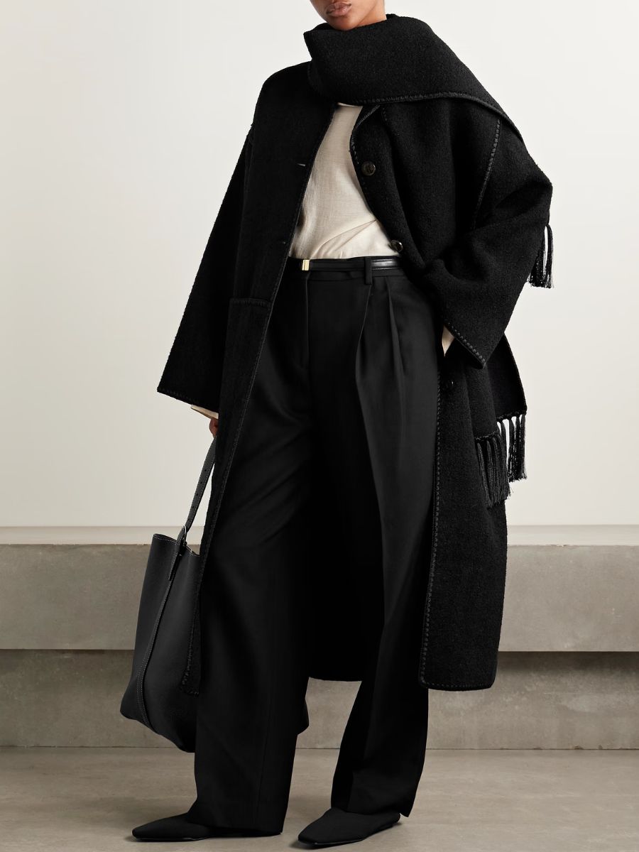 Black draped fringe wool-blend bouclé coat, Toteme, €1,120; www.net-a-porter.com.