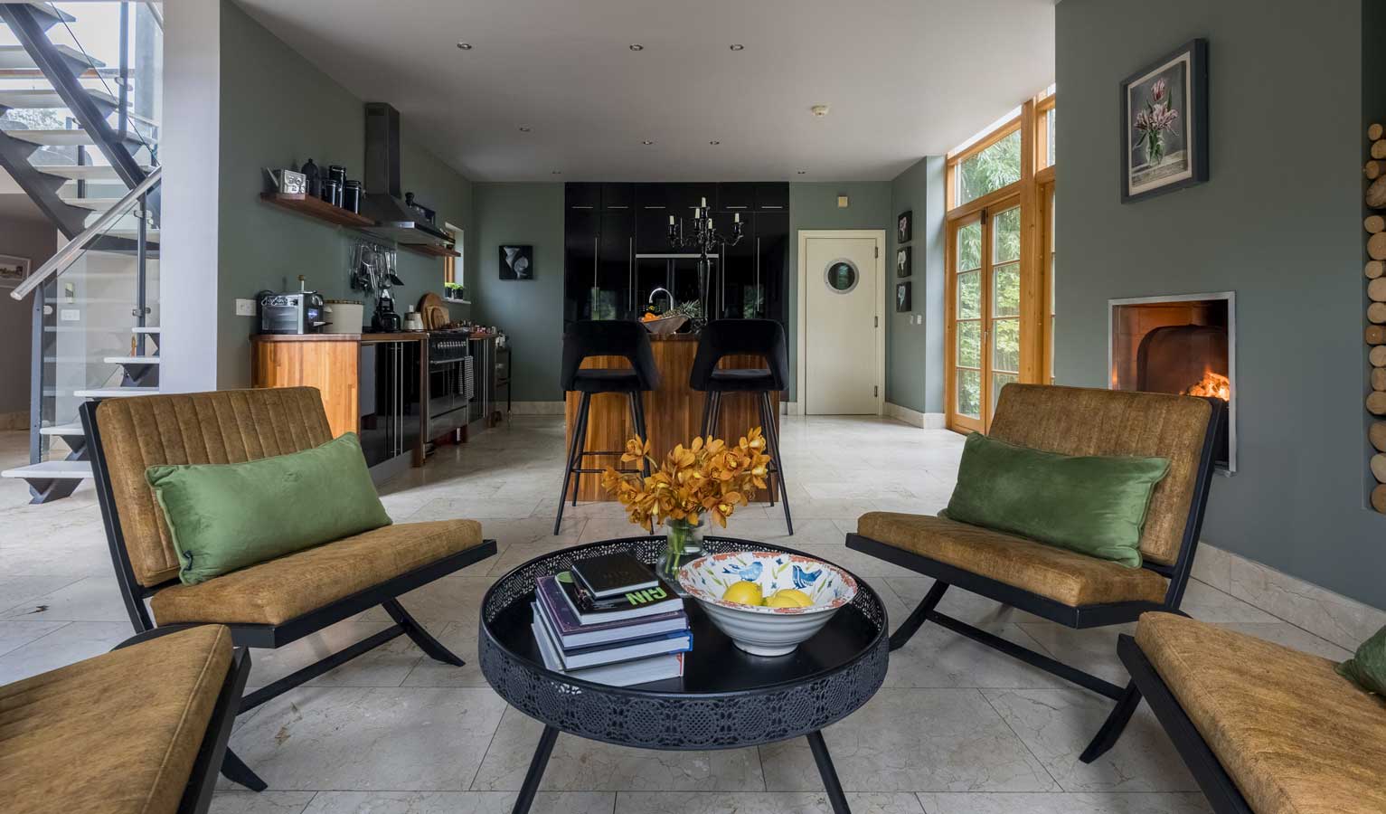 The interior design is rustic with an earthy edge, described as a mix between the charm of a countryside retreat with the polish of a bright city abode.