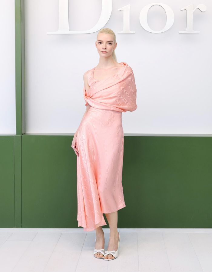 Anya Taylor-Joy wore a Dior Pre-Fall 2026 pink silk dress with Dior shoes.