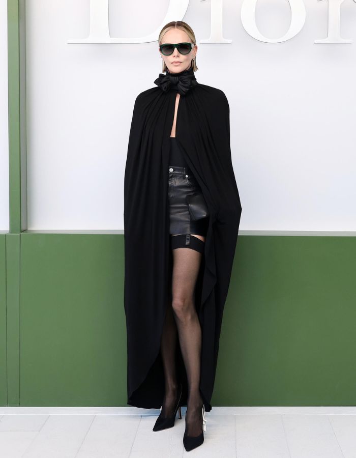 Charlize Theron wore a Dior silk cape, leather skirt and necktie.
