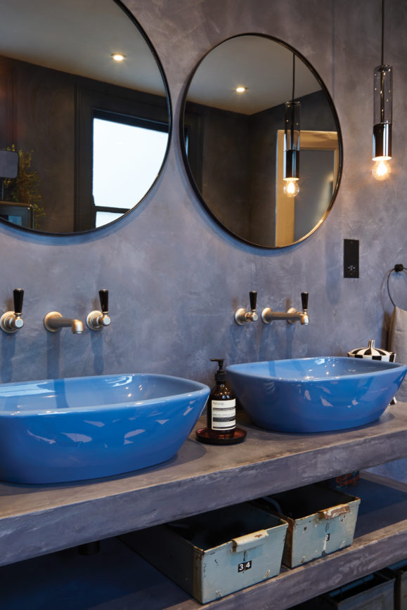 The bathroom has a Tadelakt wall finish and blue fittings. “Coloured sanitaryware is in fashion: we found a company that offers old suites and serviced parts.”