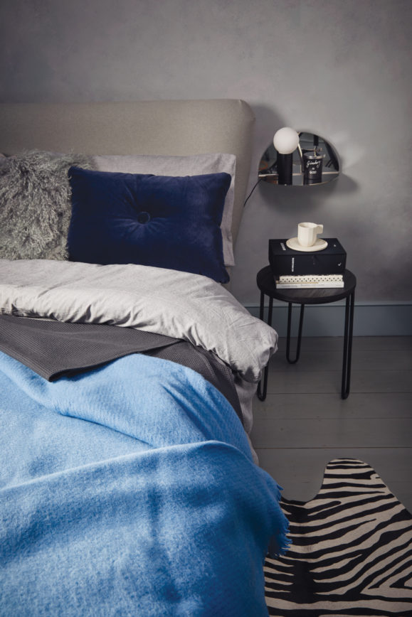 The bed is from Heals; the side table and lights from Hay.