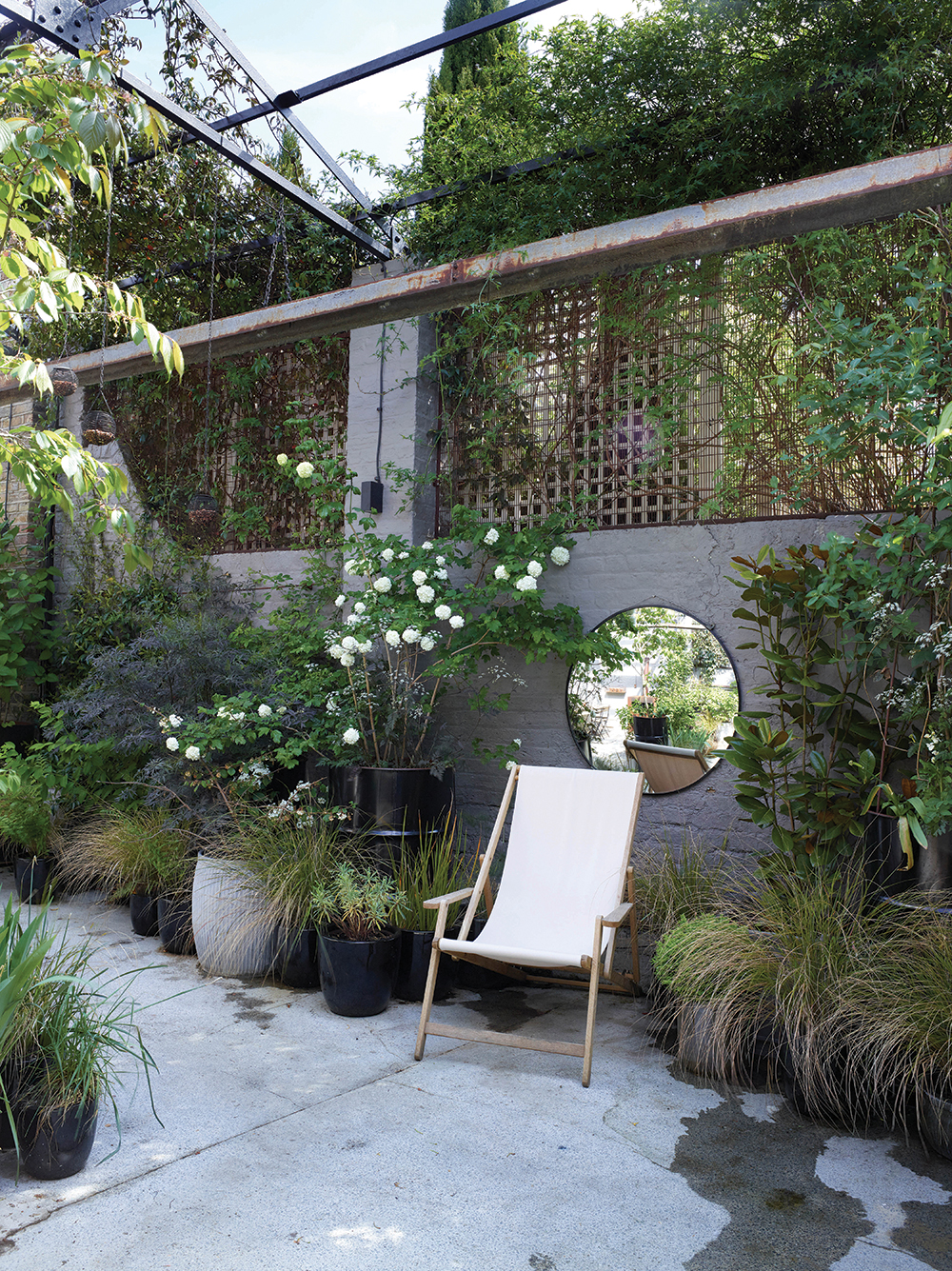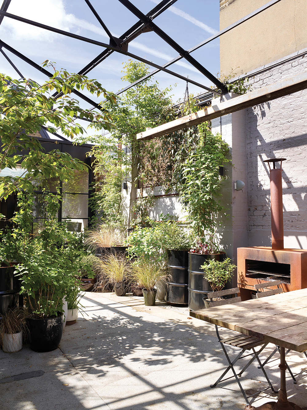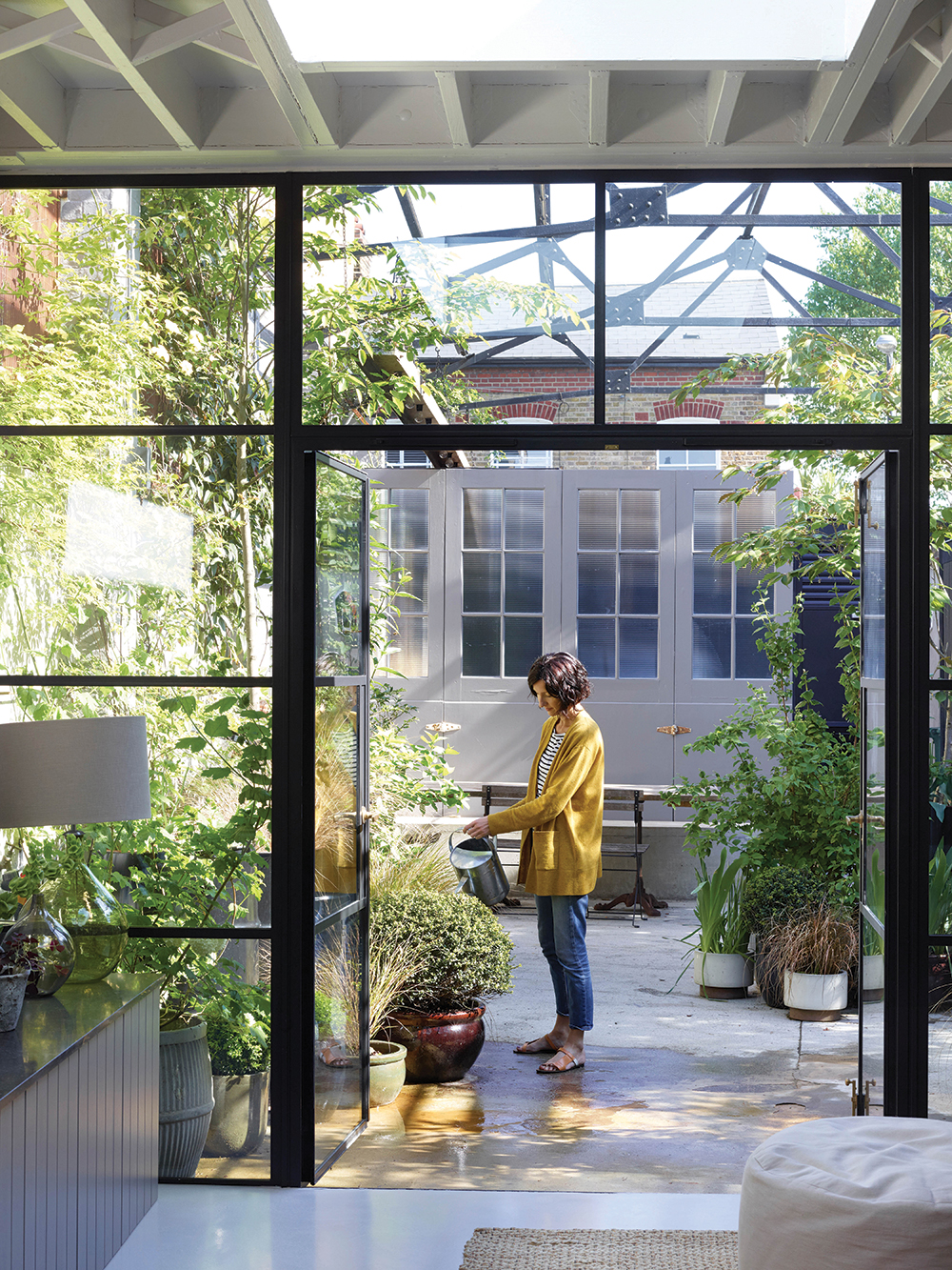 Sandwiched between a row of ordinary South London terrace houses, their chic home was formerly an unprepossessing dairy, then an ice-cream store, and latterly a down-at-heel workshop. Nothing indicates to the casual passerby that beyond a modest metal shuttered frontage lies a verdant jewel of a courtyard inspired by the hidden shared gardens tucked away behind austere doorways all over central Paris.