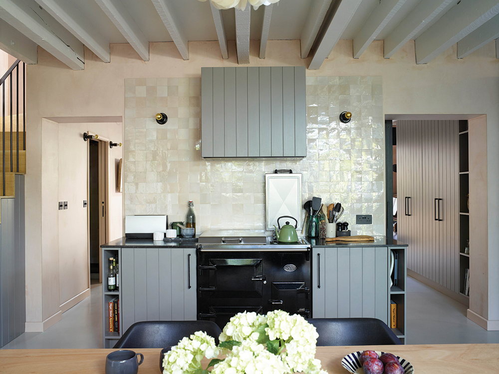 Beth and Andrew exposed and painted the original roof trusses in this open-plan space which houses the kitchen and living room. “We’ve created a sense of continuity by sticking to the same finishes, including natural plaster walls, tongue-and-groove cabinetry and a mid-century feel throughout,” says Beth.