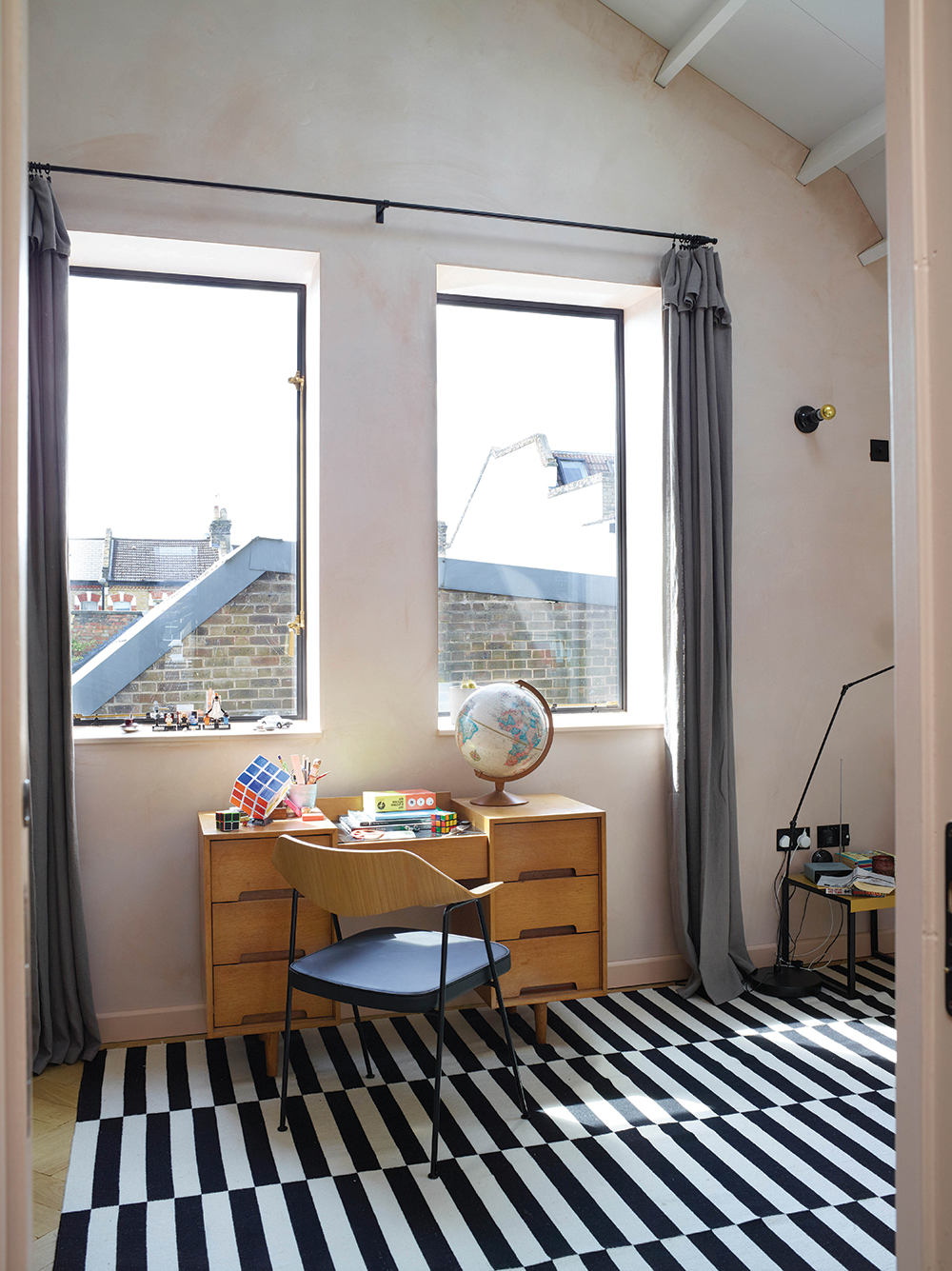 Beth and Andrew’s son Louis’ room, with mid-century desk and graphic rug. The original roof trusses remain exposed and were painted throughout the house.